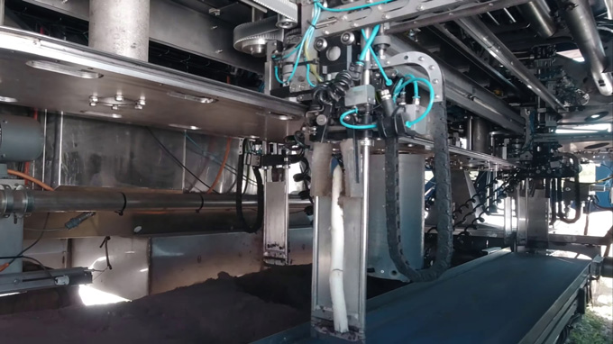 The harvesting process of the AvL Compact S1560 is very dynamic. Once the machine is positioned and set in motion, the surface of the soil is scanned. The precise location of an asparagus tip is detected by the main controller through the use of laser sensors, together with an additional optical process. A variable number of harvesting modules move in the process round a circular track inside the robot. At present, this consists of twelve of the around 25 centimeter high cassettes. They are adjusted to the speed of the robot and control the entire process of inserting, cutting and gripping.